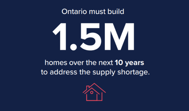 온타리오는 현 공급부족 상태를 극복하기 위해서는 앞으로 10년동안 1.5 milion 개의 주택을 반드시 지어야 한다. 따라서 온타리오 정부는 앞으로 10년동안 1.5M 개의 주택을 짓는 목표를 반드시 세워야 한다.