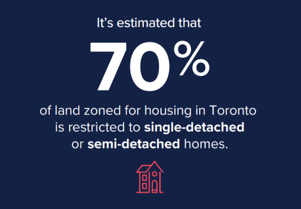 토론토에서는 주택 지구로 지정된 토지의 70%는 단독주택이나 반단독 주택을 짓는 것만 허용되어 있다. 이것은 토론토내 주택 소유자가 임대수익 창출을 만들어 내기 위한 주택 개조가 불가능하다는 것이다.
