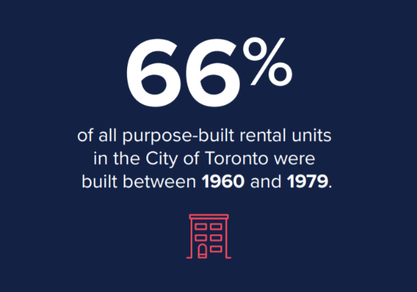 토론토시내에 있는 렌탈 전용 아파트나 주택의 절반이 넘는 66%는 1960년부터 1979년 사이 19년동안에 지어진 것들이다. 무슨 말인가 하면… 저렴한 임대용 주거지를 점점 더 찾기 힘들어 졌다는 것이다. 17979 년 이후 현재까지 40년 동안 토론토 인구가 급격하게 증가한 반면 임대 전용 주택의 건설은 단지 15%도 되지 않았다.
